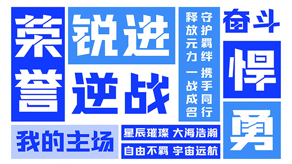 笔画的个性化处理是这款字体的一大亮点:字体以直线和直角为核心造型语言,横竖交汇处采用斜切设计,自带动态速度感;部分斜笔则以横切与竖切处理,恰似元力技能释放的干净利落。